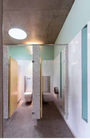 The building replaced the tired 1980’s amenity block, creating a space abundant with natural light and ventilation. The circular skylights form a glow throughout the interior, highlighting the inspired use of sea shades.